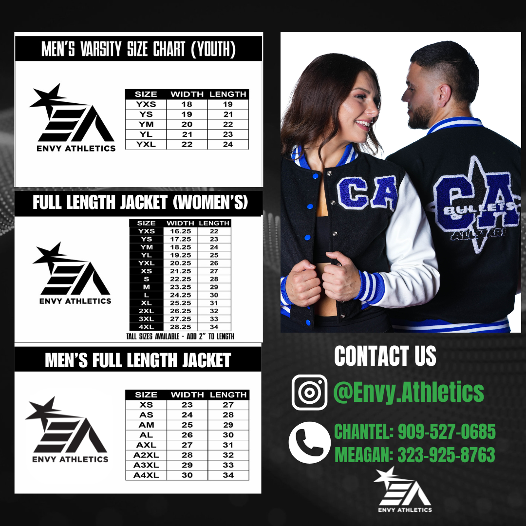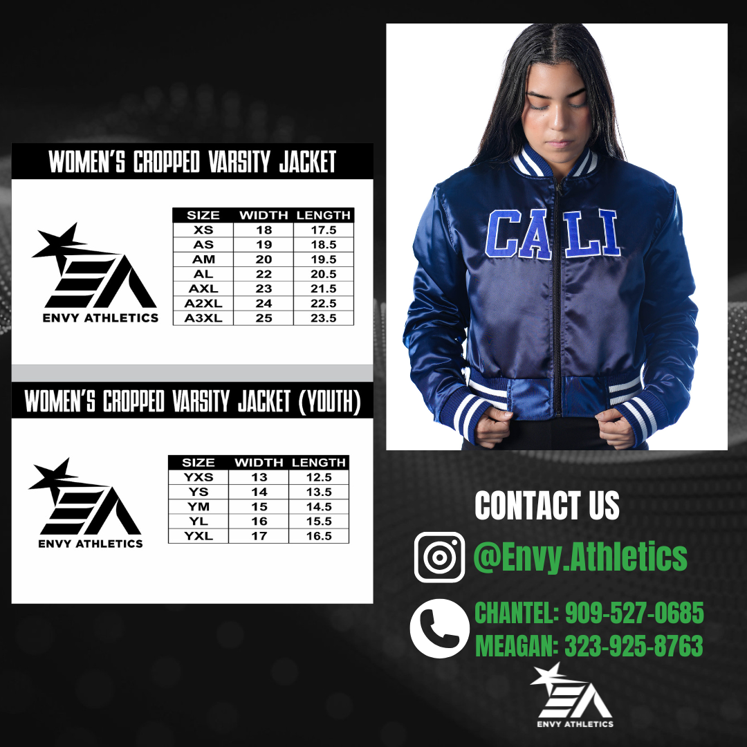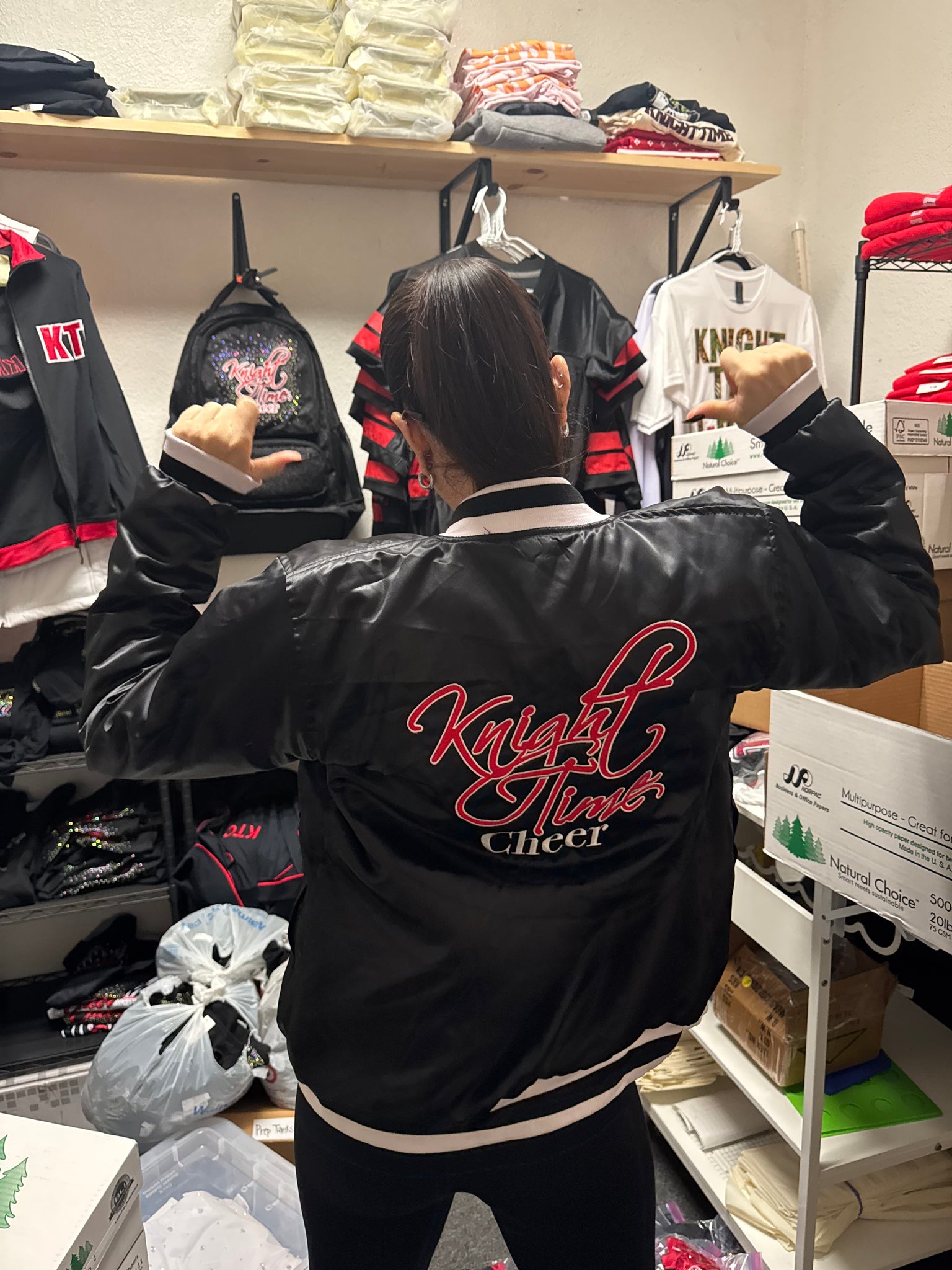 Bomber jacket with black satin throughout and tackle twill design in front and back. Rhinestones are featured in the back. This is for ANYONE, not just athletes.
